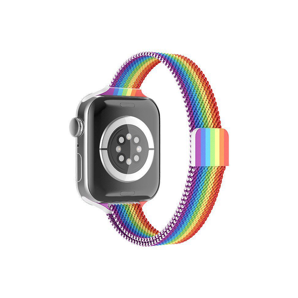 Crafted from a smooth and flexible Milanese steel mesh, this Rainbow Pride Aurora Slim Milanese Band for Apple Watch is comfortable to wear and effortless to adjust.