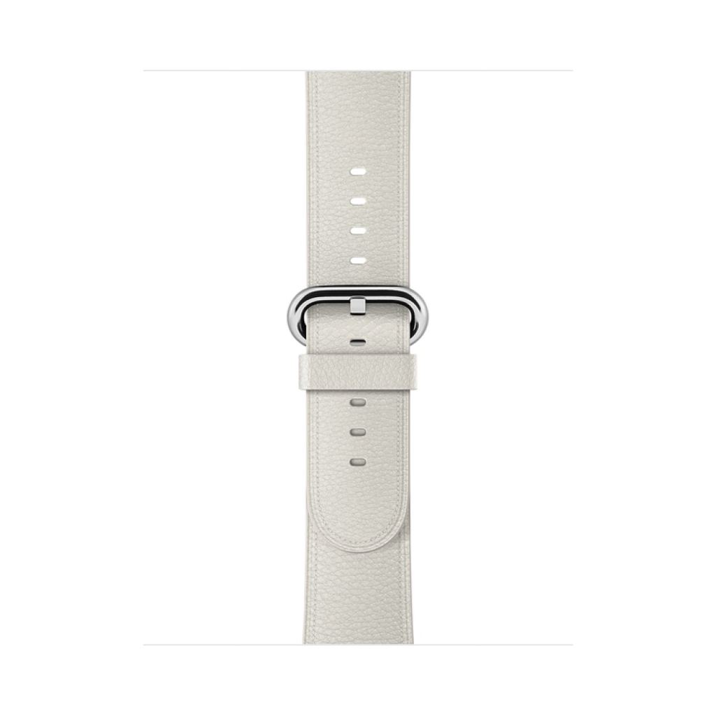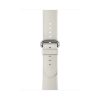 The White Classic Leather Buckle for Apple Watch is made from a calf leather that ages naturally over time to acquire a beautiful look. The exterior leather grain and contrasting interior lining creates a dramatic two-tone look, and the colour-matched edge stitching provides a subtle complement.